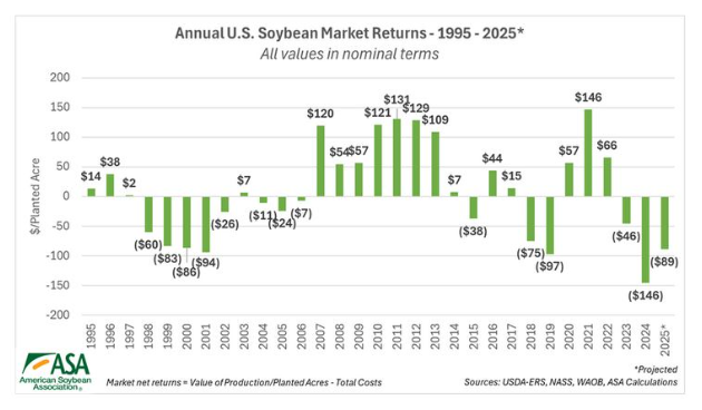 La producción de soja en Estados Unidos atraviesa uno de sus ciclos más difíciles de las últimas décadas. Según datos publicados por la Asociación de Productores de Soja de EE.UU. (ASA), para la presente campaña 2025/26 se proyecta una pérdida promedio de 220 u$s/ha. Este escenario marca el tercer año consecutivo de rentabilidades negativas, una situación que hoy solo es contenida gracias a los generosos subsidios estatales del gobierno estadounidense.