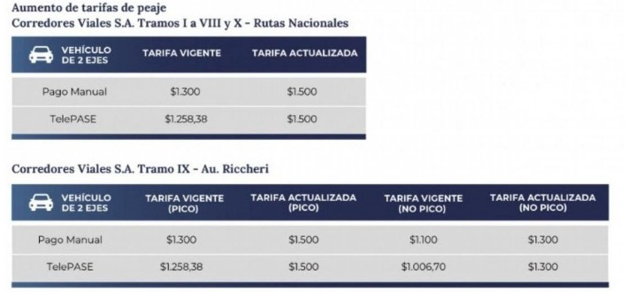 Las subas alcanzan a las estaciones de peaje que integran los tramos I al X de Corredores Viales S.A., empresa estatal que administra diferentes rutas y autopistas nacionales.
