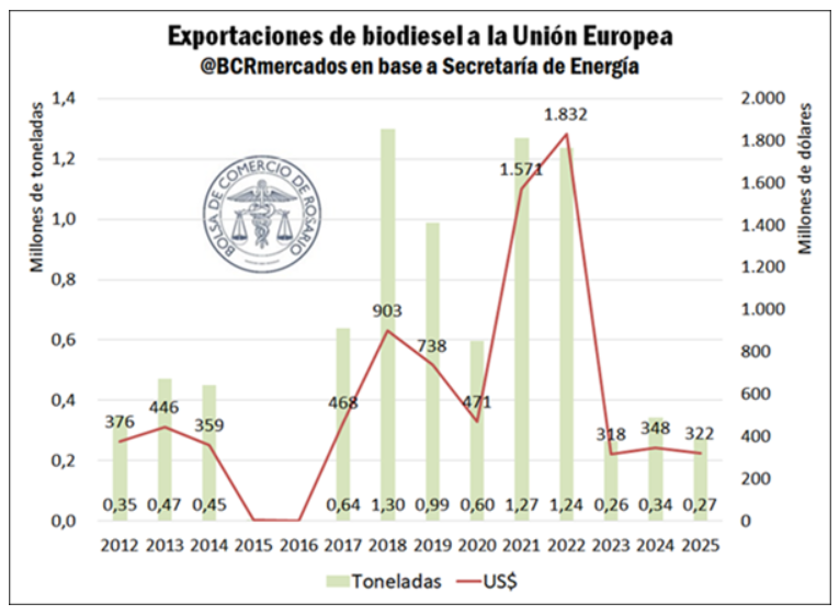 Sin embargo, el factor que más preocupa a los empresarios y analistas del sector es la inminente resolución de la Comisión Europea. El órgano ejecutivo del bloque continental puso en consulta un borrador de reglamento que revisa la metodología sobre el riesgo por el llamado cambio indirecto del uso del suelo (iLUC). Bajo estos nuevos criterios, la Unión Europea ha decidido incluir a la soja como un cultivo de alto riesgo. Si este reglamento llega a aprobarse bajo los términos actuales, para el año 2030 el biodiesel a base de aceite de soja —que constituye la totalidad de la oferta exportable argentina— tendría prohibido el ingreso a los puertos europeos. La gravedad de esta situación es absoluta si se tiene en cuenta que, durante el último año, el 100% de las exportaciones de biodiesel de nuestro país tuvieron como destino único a la Unión Europea.