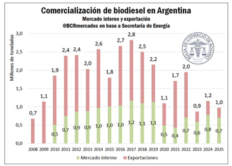 La industria de los biocombustibles en el Cordón Industrial de San Lorenzo y su zona de influencia se encuentra hoy frente a una encrucijada que combina debilidad interna y amenazas externas sin precedentes. De acuerdo a los datos procesados por la Bolsa de Comercio de Rosario en su último informativo semanal, el cierre del año 2025 ha dejado una herida profunda en las planillas de resultados de las terminales portuarias: por primera vez en casi dos décadas, las exportaciones de biodiesel representaron apenas el 28% del volumen total producido en el país. Este dato no es solo una cifra estadística, sino que representa el punto más bajo en la historia de una industria que fue concebida y desarrollada con un perfil netamente exportador, llegando a colocar en los mercados externos más del 65% de su producción en años de bonanza.