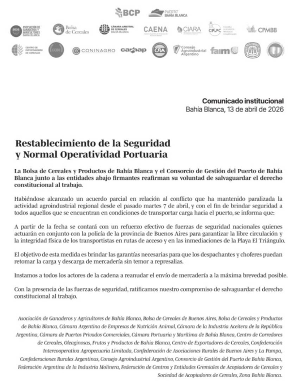 A través de un comunicado titulado “Restablecimiento de la Seguridad y Normal Operatividad Portuaria”, más de una decena de entidades del sector agroexportador —incluyendo a CIARA, el CEC y la Bolsa de Cereales— instaron a reanudar el envío de mercadería de forma inmediata. En el texto, ratificaron el compromiso de salvaguardar el derecho constitucional al trabajo mediante la presencia de los efectivos.