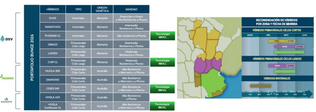 La propuesta incluye la entrega de semilla híbrida de compañías como DSV, Nuseed y Advanta, junto con planes de financiación y acompañamiento técnico durante todo el ciclo productivo. La oferta contempla tanto híbridos invernales, para siembras entre marzo y comienzos de abril en el sur de la región pampeana, como primaverales, que pueden implantarse entre marzo y junio en el norte.