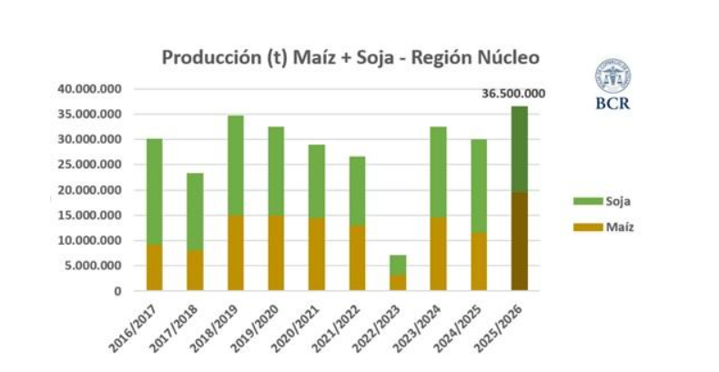 Los resultados obtenidos en las tolvas no solo trajeron alivio por el avance físico de la trilla, sino también por el volumen recolectado. Las estimaciones para la región núcleo subieron en 800.000 toneladas adicionales. Ahora alcanzan un total proyectado de 19,7 millones de toneladas para la soja. Este ajuste positivo responde a rindes que, en la franja oeste y central de la región, están superando las expectativas iniciales. Estas expectativas habían sido castigadas por el calor de enero y las lluvias excesivas de marzo.
