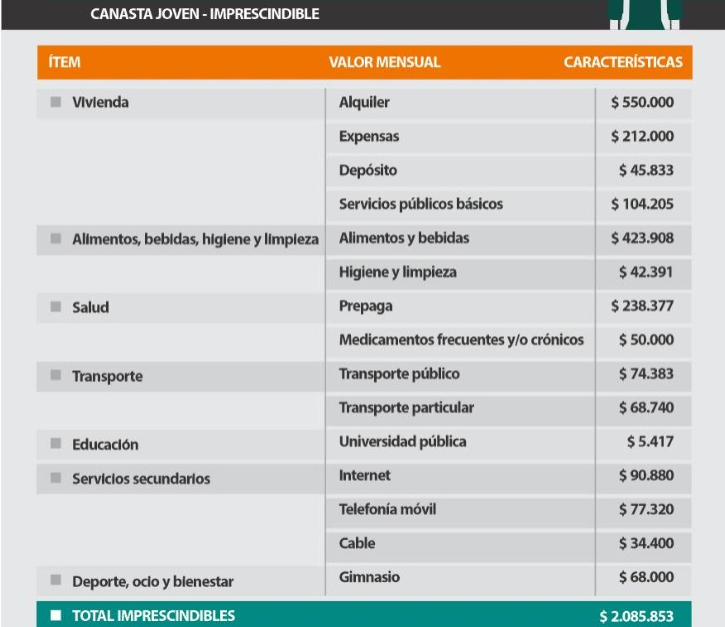 Un informe elaborado por Focus Market, a partir de una estimación denominada “Canasta Joven”, calculó cuánto dinero necesita por mes una persona de entre 20 y 30 años para sostener una vida independiente. El resultado es contundente: los gastos mínimos alcanzan los $2.085.853 mensuales.