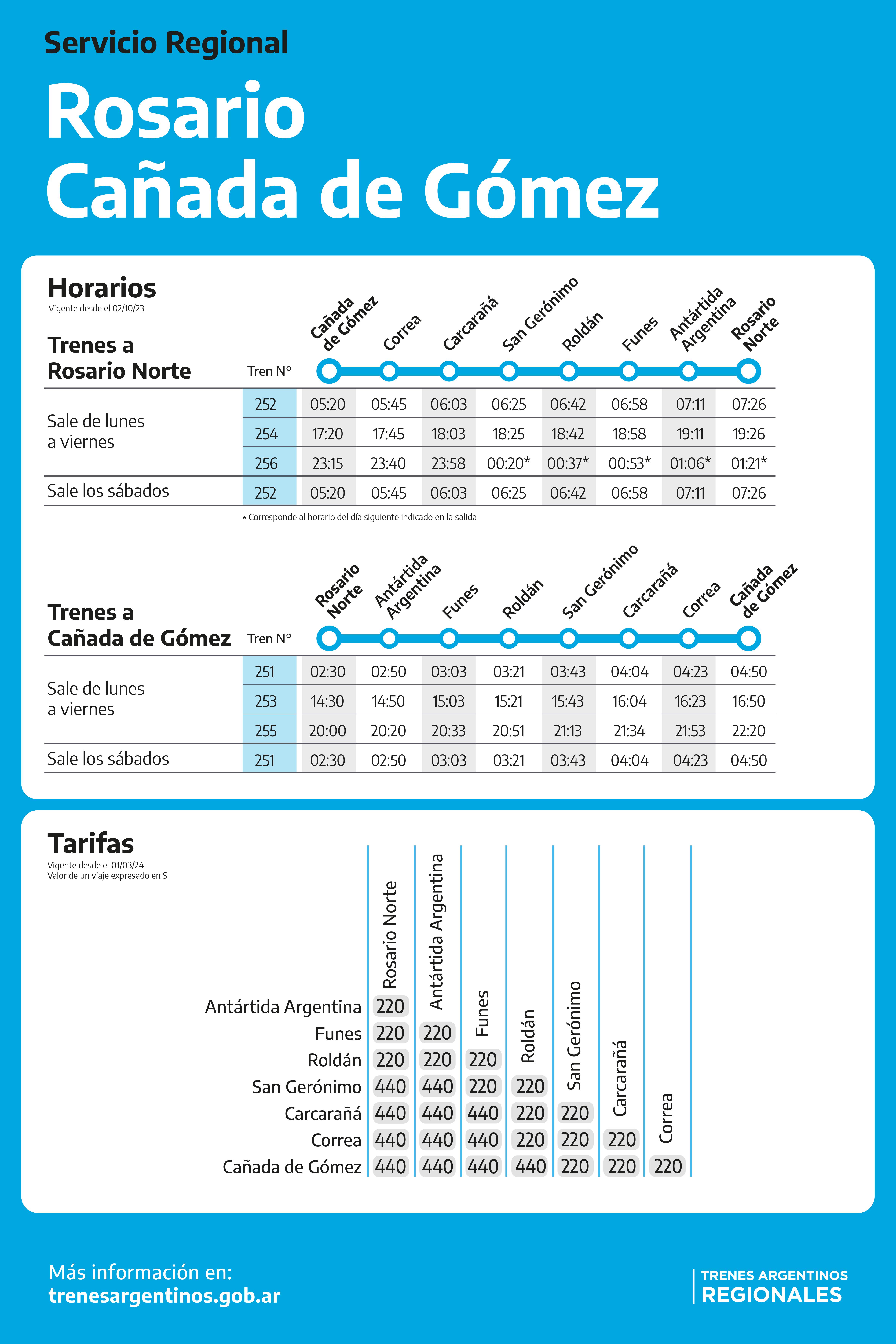 El incremento estará disponible este viernes 1° de marzo, y será del 70%, dado que el costo del pasaje para ir desde Funes a Rosario y Roldán pasará de valer $130 a $220. En tanto, para viajar a Carcarañá, Correa y Cañada de Gómez, el nuevo precio será $440 (antes $260). Así, este será el segundo aumento que sufre el boleto del tren regional, dado que, en enero, tuvo una actualización del 45% y el costo pasó de $90 a $130.