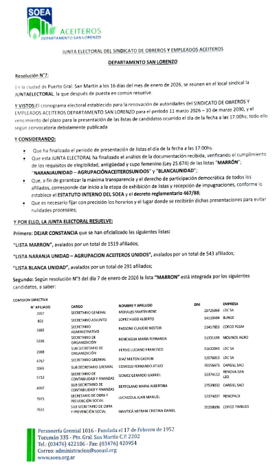 La Junta Electoral del Sindicato de Obreros y Empleados Aceiteros (SOEA) del Departamento San Lorenzo confirmó esta mañana la oficialización definitiva de las agrupaciones que participarán en los comicios del próximo 10 de marzo. El anuncio se produce luego de haber concluido ayer por la tarde el plazo legal para la presentación de impugnaciones sin que se registraran objeciones que alteraran el proceso.