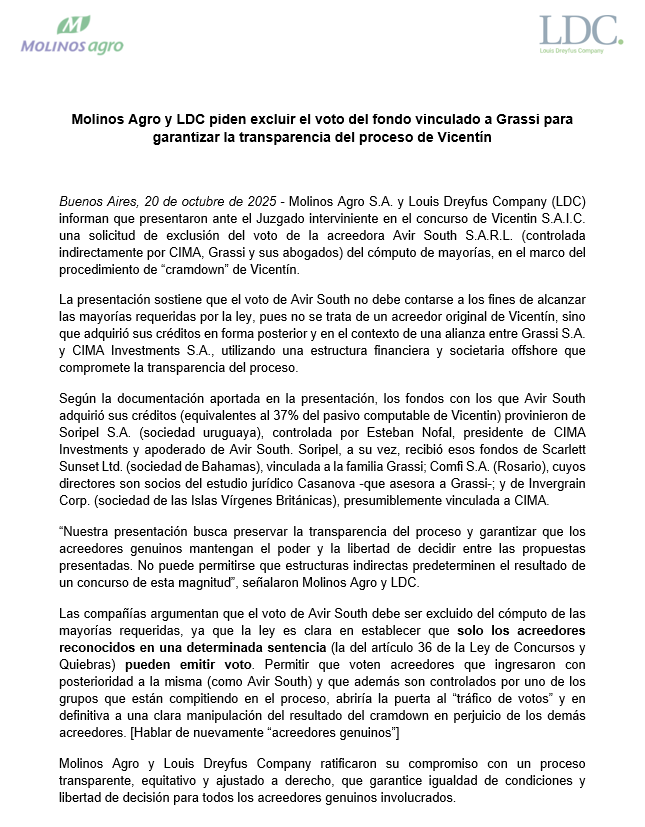 Molinos Agro S.A. y Louis Dreyfus Company (LDC) informan que presentaron ante el Juzgado interviniente en el concurso de Vicentin S.A.I.C. una solicitud de exclusión del voto de la acreedora Avir South S.A.R.L. (controlada indirectamente por CIMA, Grassi y sus abogados) del cómputo de mayorías, en el marco del procedimiento de “cramdown” de Vicentín.