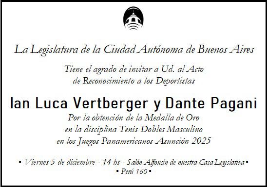 La Legislatura de la Ciudad Autónoma de Buenos Aires distinguirá este viernes al joven tenista sanlorencino Dante Pagani, quien junto a Ian Luca Vertberger obtuvo la medalla de oro en Tenis Dobles Masculino en los Juegos Panamericanos Asunción 2025