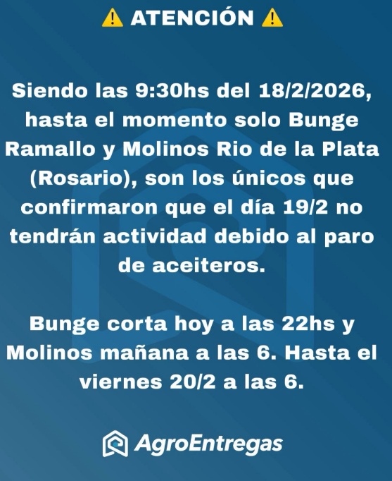 Según la información confirmada, Bunge Ramallo interrumpirá sus operaciones este miércoles a las 22:00 horas, mientras que Molinos Río de la Plata lo hará mañana a las 6:00, extendiendo el cese hasta el viernes 20 de febrero a las 6:00.
