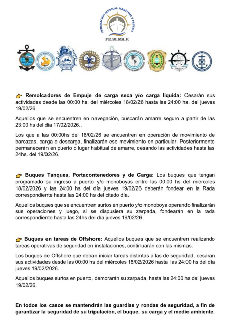 En el caso de buques tanques, portacontenedores y buques de carga que tengan programado su ingreso a puerto o monoboyas entre el 18 y el 19 de febrero, deberán fondear en la rada correspondiente hasta las 24:00 del jueves. Por otro lado, aquellos que se encuentren operando en puerto finalizarán sus tareas. Si se dispusiera su zarpada, también deberán permanecer fondeados hasta que concluya el paro.