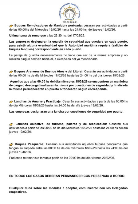 Según el comunicado oficial, los remolcadores de empuje de carga seca y líquida cesarán completamente sus actividades durante las 48 horas. Además, aquellos que se encuentren en navegación deberán buscar amarre seguro a partir de las 23:00 del martes 17. Por razones de seguridad, las embarcaciones que a las 00:00 del miércoles estén realizando maniobras de carga, descarga o movimiento de barcazas deberán finalizar esa operación puntual. Luego, deberán permanecer en puerto o en su lugar habitual de amarre hasta la finalización de la medida.