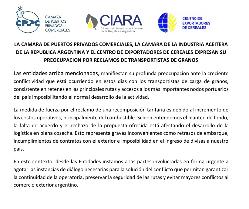 En un crítico escenario para el nodo portuario del Cordón Industrial y otros puntos del país, la Cámara de Puertos Privados Comerciales (CPPC), la Cámara de la Industria Aceitera de la República Argentina (CIARA) y el Centro de Exportadores de Cereales (CEC) manifestaron formalmente su alarma ante la creciente conflictividad con los transportistas de carga de granos.