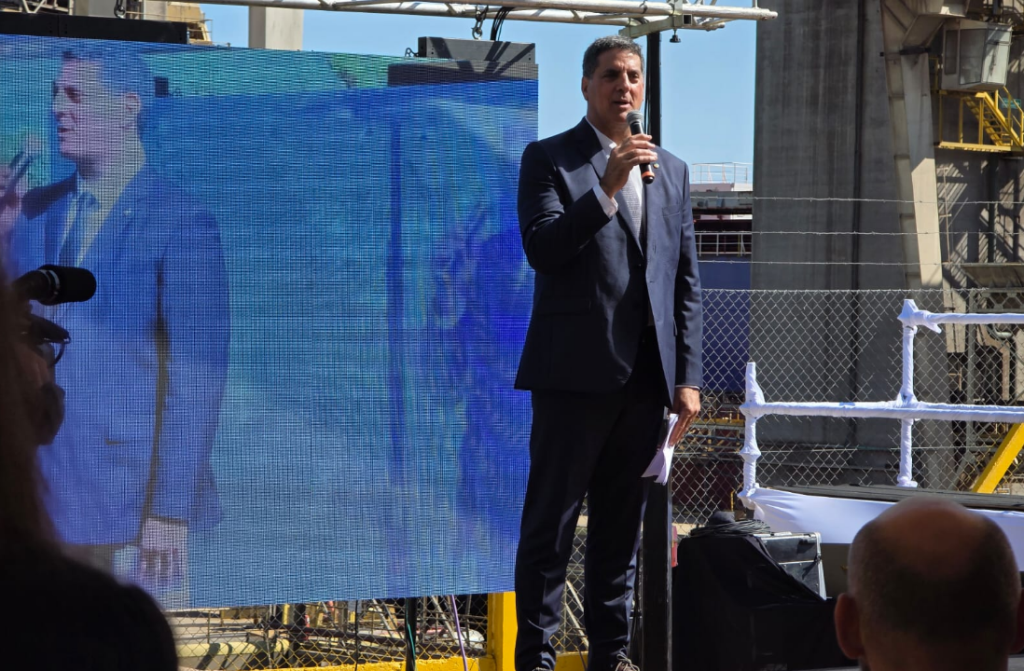 El CEO de COFCO Argentina, Alfonso Romero, fue el primero en tomar la palabra este viernes en el acto realizado en la terminal portuaria de COFCO International en Timbúes, con motivo del primer embarque comercial de trigo argentino con destino a China, un hito que inaugura un nuevo flujo comercial entre ambos países.