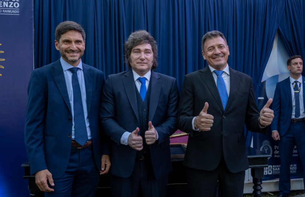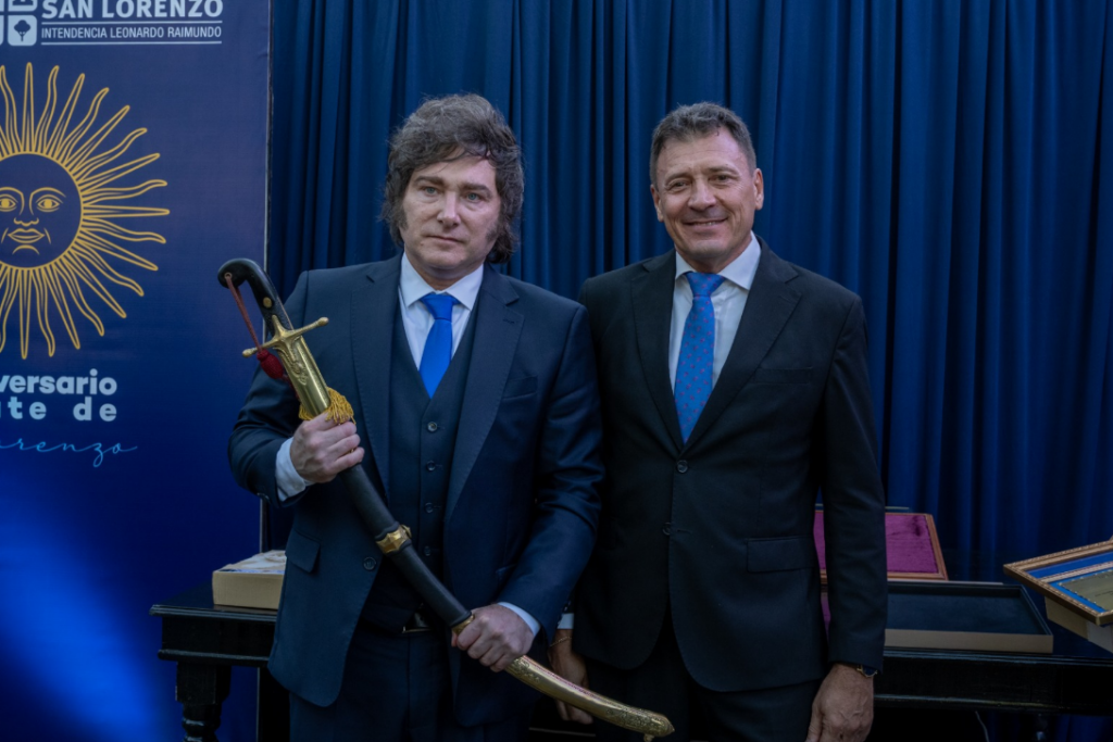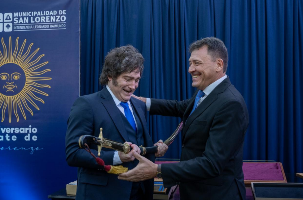 A minutos de arribar al Campo de la Gloria, y en un espacio especialmente dispuesto para la recepción de obsequios protocolares destinados al Presidente de la Nación y a la secretaria general de la Presidencia, Karina Milei, el intendente de San Lorenzo, Leonardo Raimundo, sorprendió a Javier Milei con un regalo de fuerte carga simbólica.