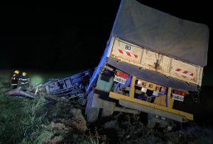 Camión se salió del asfalto, destrozó una garita de colectivos y volcó en una zanja