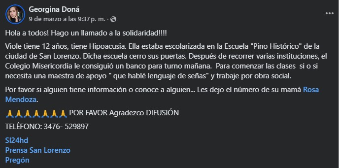 La niña, llamada Viole, tiene hipoacusia y hasta el año pasado asistía a la escuela “Pino Histórico” de la ciudad. Sin embargo, tras el cierre de esa institución, su familia debió recorrer distintas escuelas en busca de un lugar donde pudiera continuar sus estudios.