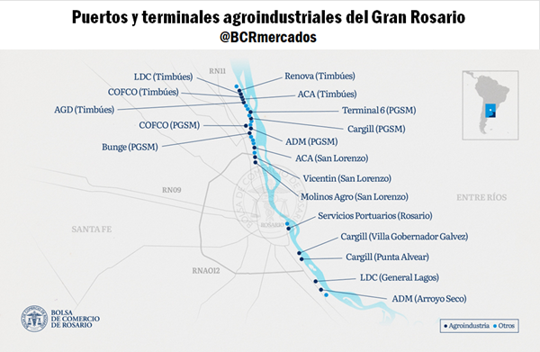 Muchas de las terminales agroindustriales cuentan con más de un muelle dentro de un mismo puerto, como es el caso de Renova, Terminal 6, COFCO, Bunge (Pampa y Dempa), ACA San Lorenzo, TPR y LDC, entre otras. Estas instalaciones despachan granos, harinas y aceites vegetales hacia los principales mercados internacionales.