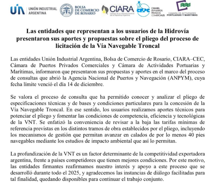 A través de un comunicado conjunto, la Unión Industrial Argentina (UIA), la Bolsa de Comercio de Rosario (BCR), CIARA–CEC, la Cámara de Puertos Privados Comerciales y la Cámara de Actividades Portuarias y Marítimas informaron que realizaron aportes técnicos con el objetivo de potenciar el pliego y mejorar las condiciones de competencia, eficiencia y desempeño tecnológico del sistema.