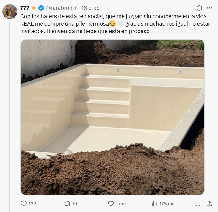 El registro audiovisual muestra la destreza del grupo para mover una estructura pesada en un espacio reducido, una situación que rápidamente generó miles de interacciones, comentarios y reacciones. Como suele ocurrir con sus publicaciones, el episodio despertó tanto elogios como críticas. Ante esto, Broin respondió con ironía: agradeció a los “haters” y bromeó con que no estaban invitados a estrenar la pileta.